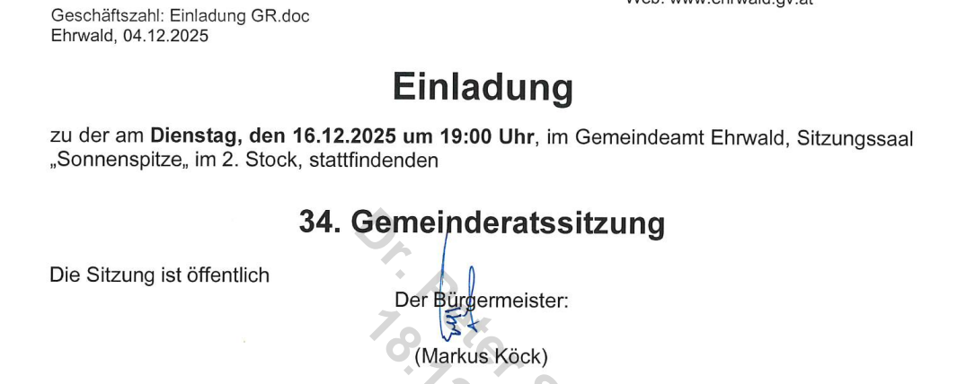 - Im Zusammenhang mit dem Aufhängen des Christbaumschmuckes an einem privaten Baum durch die FF-Ehrwald (mit der neuen Drehleiter) am Sonntag den 14.12.2025 habe ich angeregt, dass die FF-Ehrwald dafür einen formellen Kostenbedarf festlegt und dies zu einem Geschäftsmodell zur Mitfinanzierung des FF-Budgetbedarfes macht. Ortsschmuck sollte für ALLE mit klaren transparenten Konditionen möglich sein.