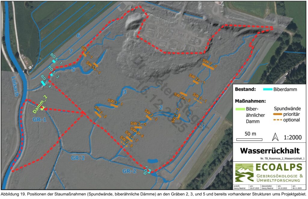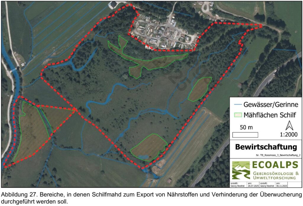Insgesamt sind 7,3 ha umfasst. Die alte Biotopkartierung musste neu gemacht werden. Ebenso werden die Wasser-Untersuchungen auch auf die umliegen Flächen (außerhalb der 7,3 ha) vorgenommen. Dadurch wird sichergestellt, dass die Nachbarn durch die veränderten Wasserpegel nicht beeinträchtigt werden. Im Zuge dessen werden sehr ausführliche Untersuchungen/Messungen des Wasserhaushaltes und der Wasserbewegungen (8 Pegelmessstellen) vorgenommen. Das bestehende Gehölze (Bäume, Sträucher) müssen raus, weil sie zu viel Wasser ziehen. Durch die Revitalisierung wird der Wasserabfluss langsamer und flächiger erfolgen. Dafür werden Spundwände in die bestehenden und ggf. neuen Gräben gesetzt. Diese können bei Bedarf auch nachträglich noch angepasst werden. In der Folge werden als erstes Pfeifengräser kommen, welche dann erst langsam durch die gewünschte Moorflora verdrängt werden. Aufwachsendes Schilf muss ausgemäht werden. Dies erfolgt in 5 einzelnen Freiflächen welche bewirtschaftet werden. Hierfür werden noch Interessenten gesucht, welche auch vom Land Tirol entsprechende Förderungen bekommen sollen.